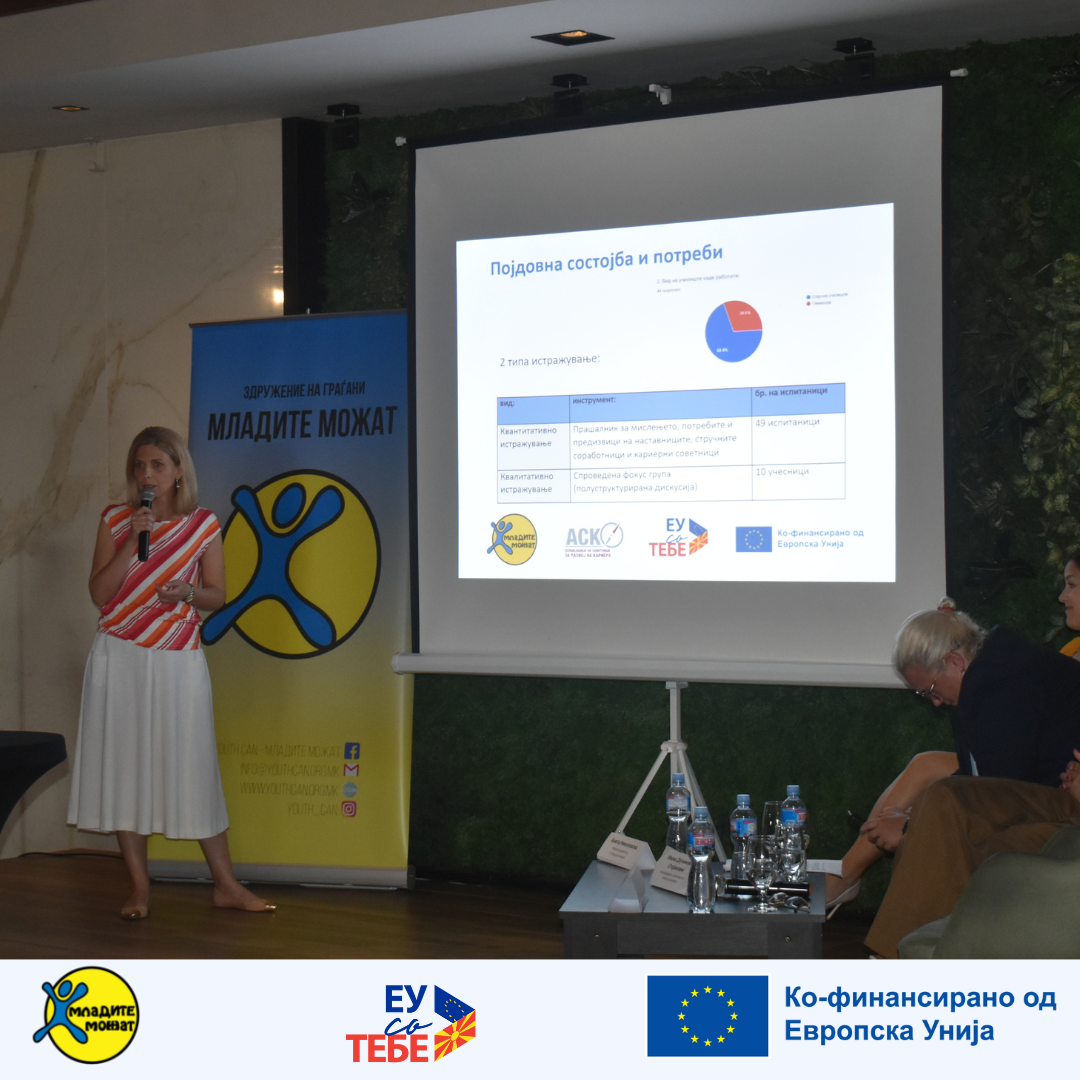 „Нашето истражување за кариерно советување започна со три анализи кои опфаќаат анкети и фокус групи со ученици и родители. Овие анализи ни дадоа до знаење дека учениците не се доволно информирани за своите можности и тие се често жртви на недоволно или неправилно учество на нестручната околина во нивните одлуки. Она на што сите вклучени се согласуваат е потребата за кариерно советување.“– сподели со присутните Ивана Дојчиновска Стојановиќ од Асоцијација на советници за развој на кариера