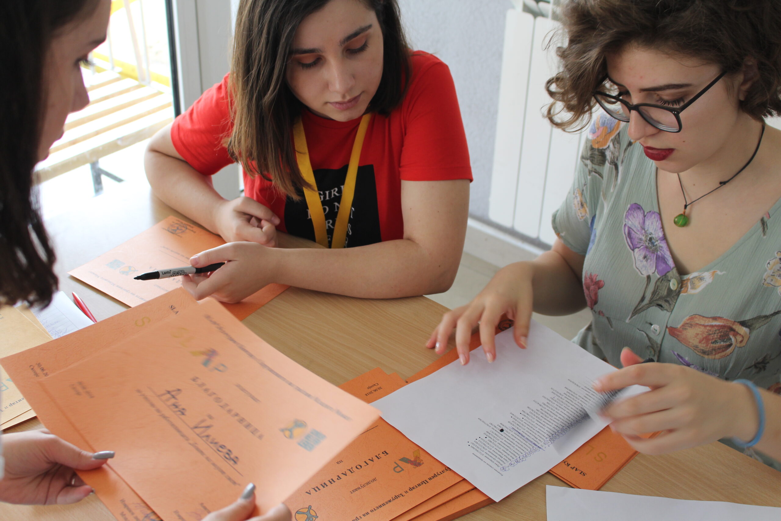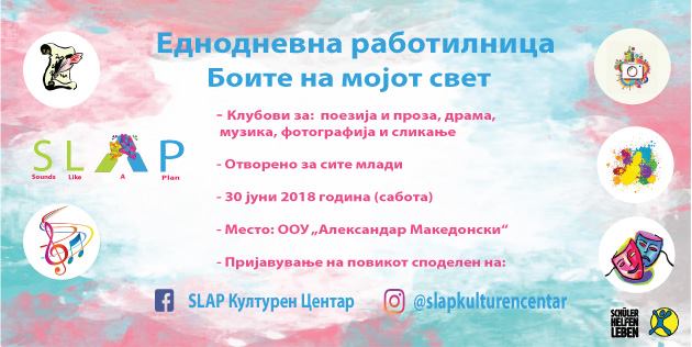 На ден 30.06.2018 год. (сабота) во просториите на ООУ „Александар Македонски” се одржа работилница на тема „Боите на мојот свет”. Просторот беше отстапен на користење од страна на Опшитна Аеродром, по претходно испратеното барање и состанок со одговорните лица од општината. Самата работилница претставуваше пилот проект како би функционирал SLAP културниот центар. Настанот беше предвиден да започне во 10:30 часот со регистрација на учесниците. Учесниците се пријавија на претходно подготвен повик, кој беше отворен до 29.06.2018 год. до 17 часот. Присуствуваа вкупно 50 учесници, кои беа распределени во 5 клубови (поезија и проза, фотографија, драма, сликање и музика) според информациите кои ги пополниле во пријавата. Настанот започна во 11:00 часот. Организацискиот тим, составен од:Никица Манџуковски, Елена Киранџинска, Елена Пауноска и Сања Јонческа, го отвори настанот и им се заблагодари на учесниците за нивното присуство. Тие им го претставија проектот на учесниците, нивната замисла и мотивација за организација на истиот, по што накратко се осврнаа на агендата која беше предвидена за тој ден. За учесниците целосно да бидат опуштени и нивната креативна мисла да се разбуди беше подготвена една друштвена игра. Учесниците требаше да се поделат во парови и да смислат по две вистини и една лага за себе. Потоа да ги споделат тие информации со своите партнери, а тие да погодат што е вистина, а што лага. Следуваше дваесетминутна кафе пауза, а потоа започнаа и самите работилници. Работилниците се одвиваа во 5 училници и беа составени од два дела. Секоја работилница имаше свој мотиватор: