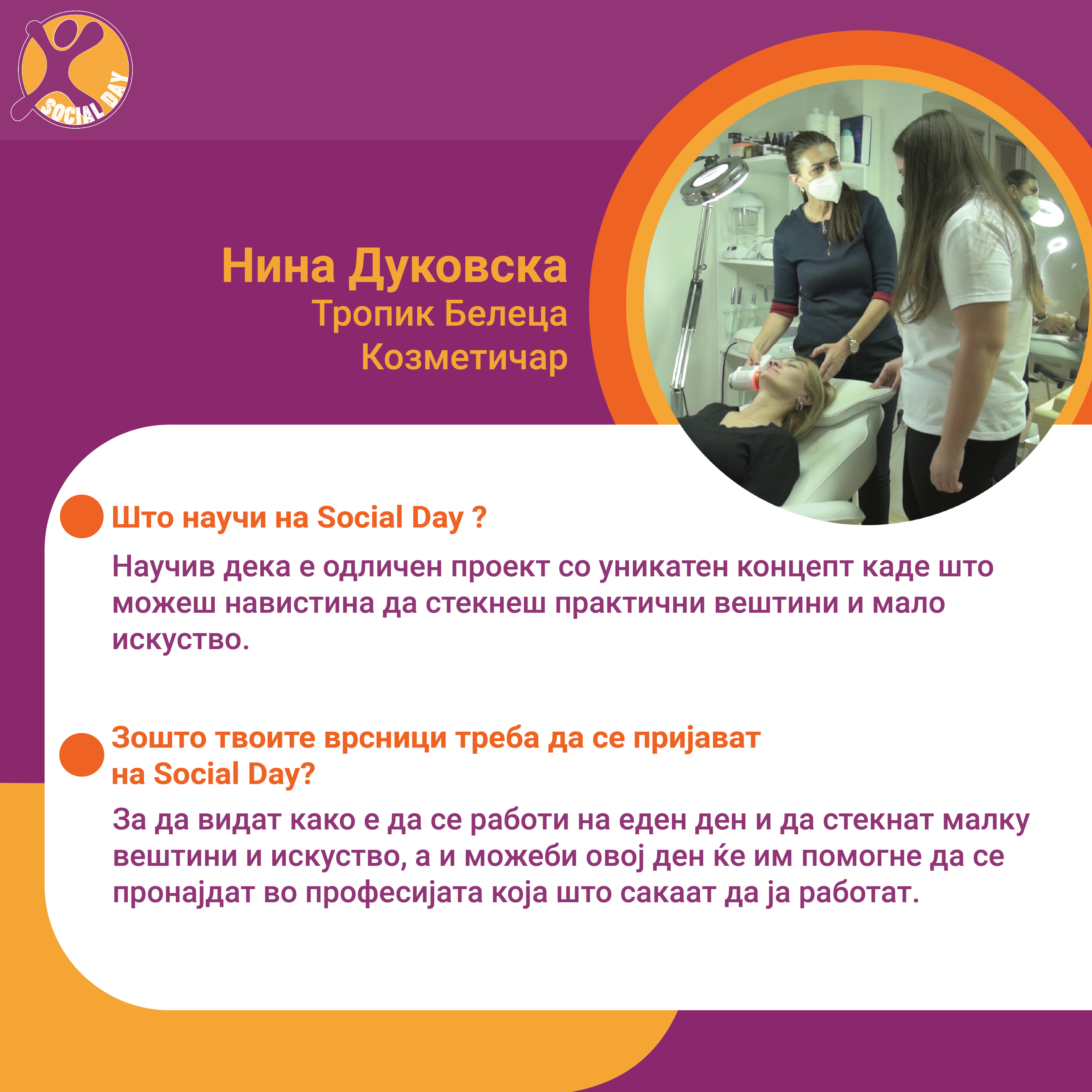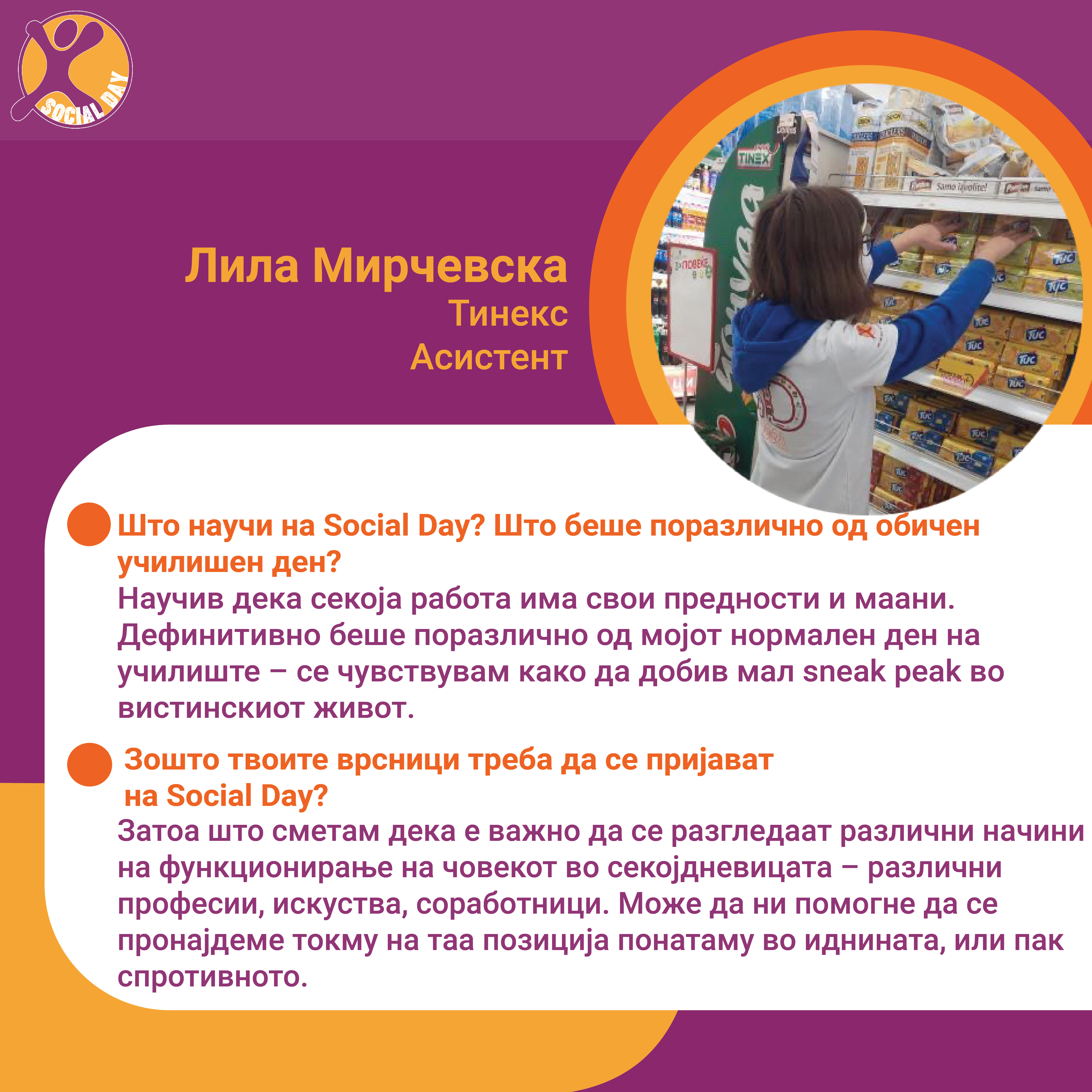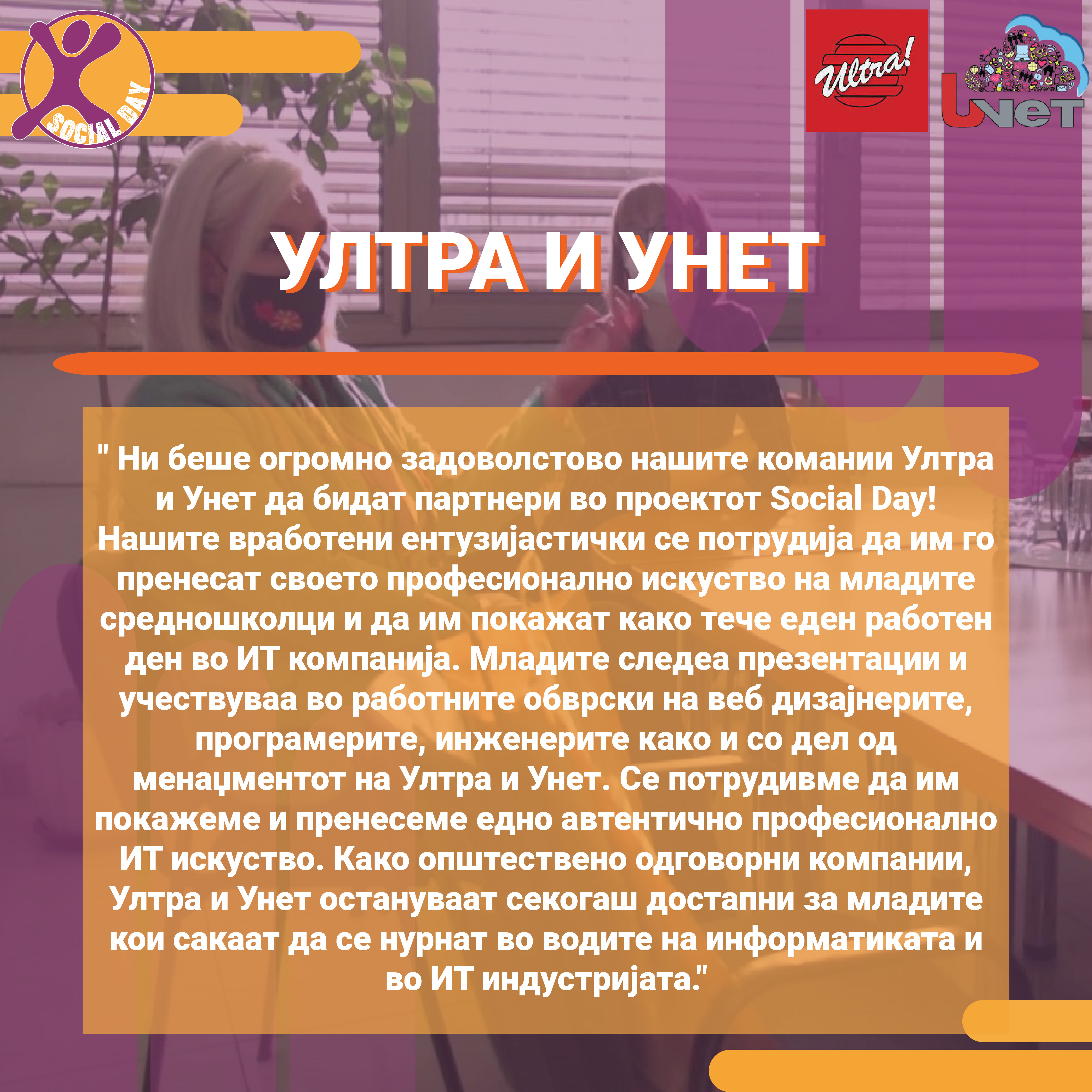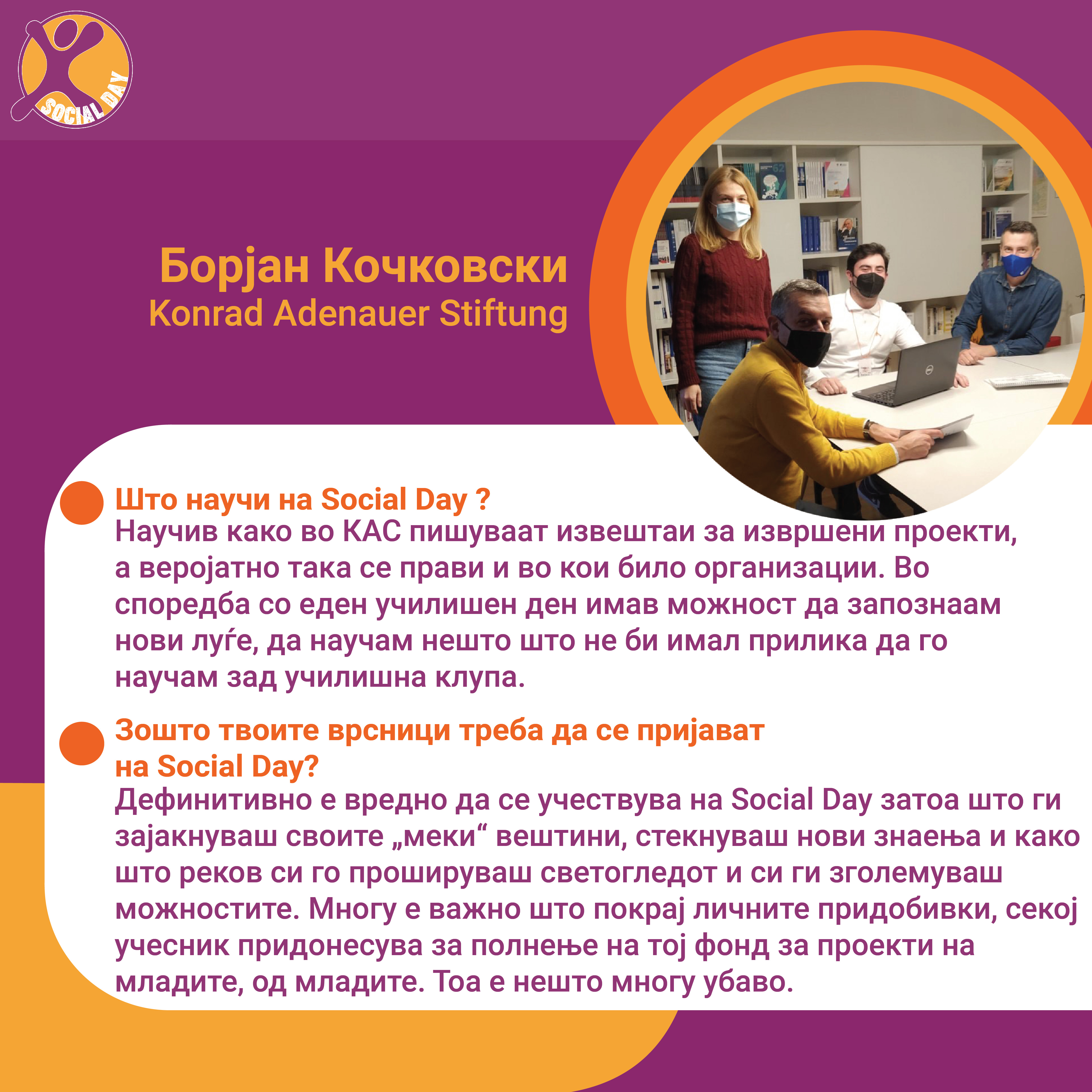 Токму ова се главните резултати од првиот SOCIAL DAY во Северна Македонија, спроведен од Здружение на граѓани Младите можат на 10ти ноември 2021г. На овој ден 30тина домашни компании и организации земаа учество и обезбедија позиции за над 80 средношколци, меѓу кои: Центар за Младински Активизам Крик, Ултра, Фондација Фридрих Еберт, кафуле СКУП, Македонски центар за меѓународна соработка, Кодит Солушн, Приватна агенција ДЕКРА , ИТ Лабс, Фондација Конрад Аденауер, козметичко студио Тропик Белеца, ЛЕАД Скопје, Бизнис академија Смилевски, ЕУРОНИКЛ – Кавадарци, ПЗУ Аптека ДНА АННИ ФАРМ, Национален Младински Совет на Македонија, РЕСОРТ МАВРОВО, Ултранет, Микел, Тинекс маркети, Рудник Бучим Радовиш