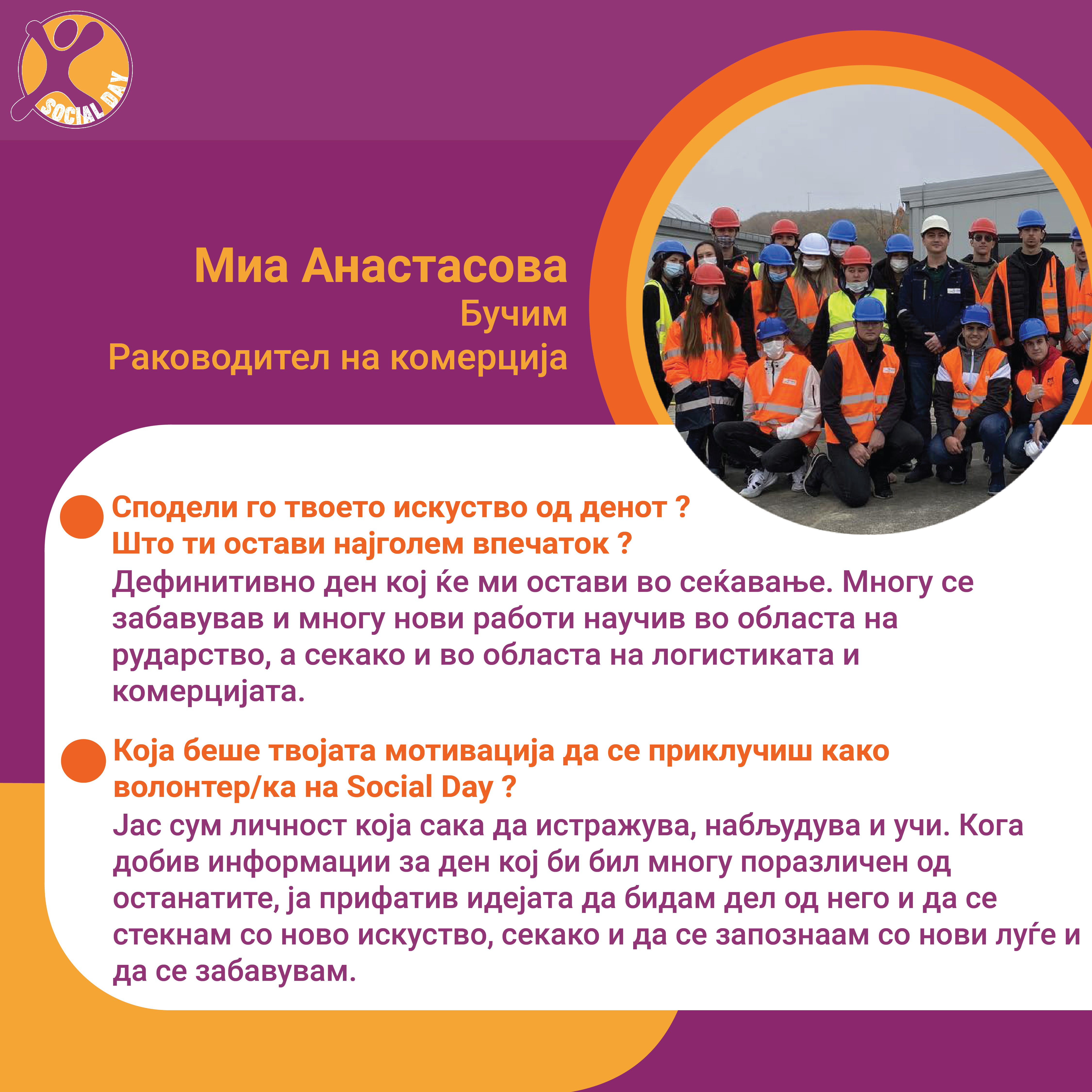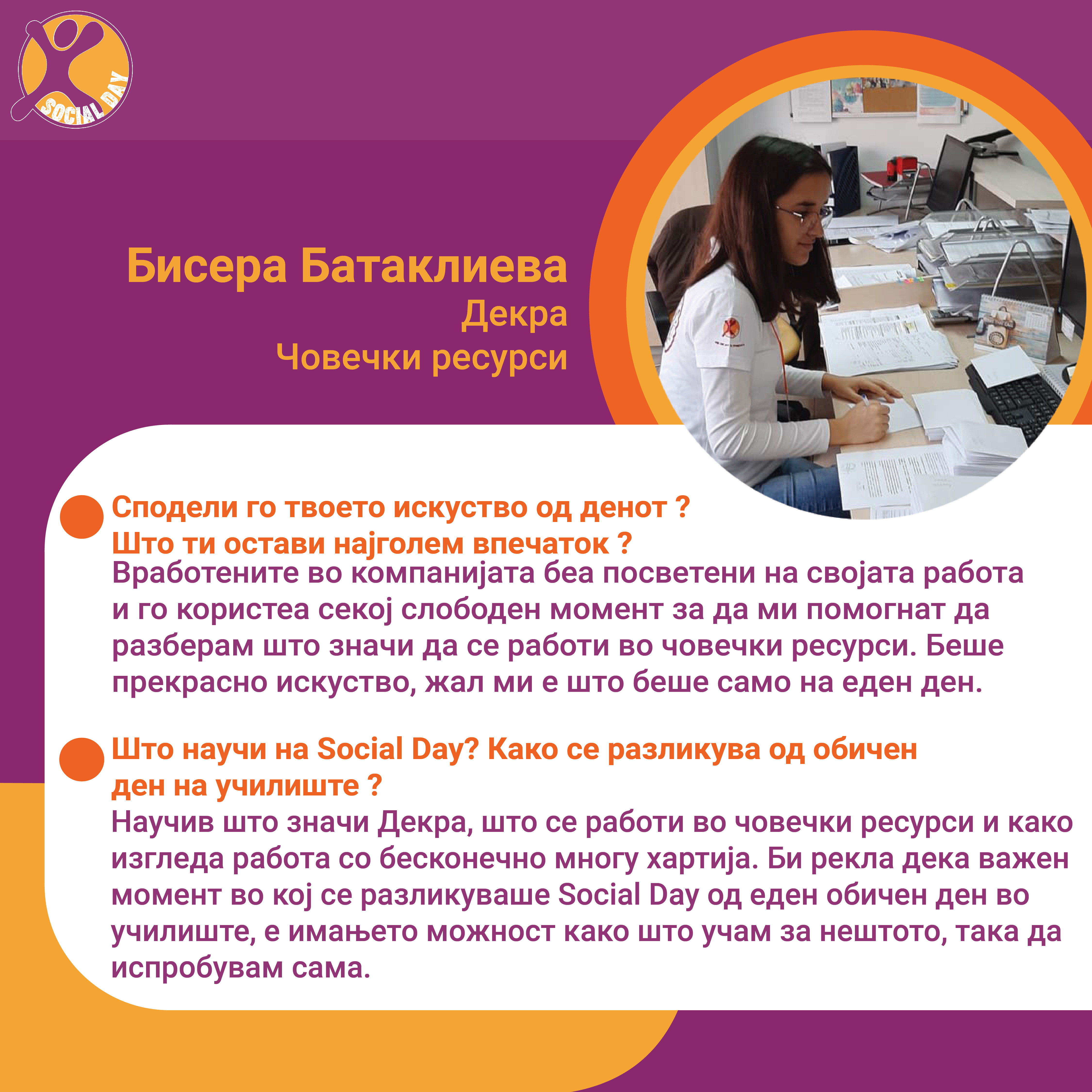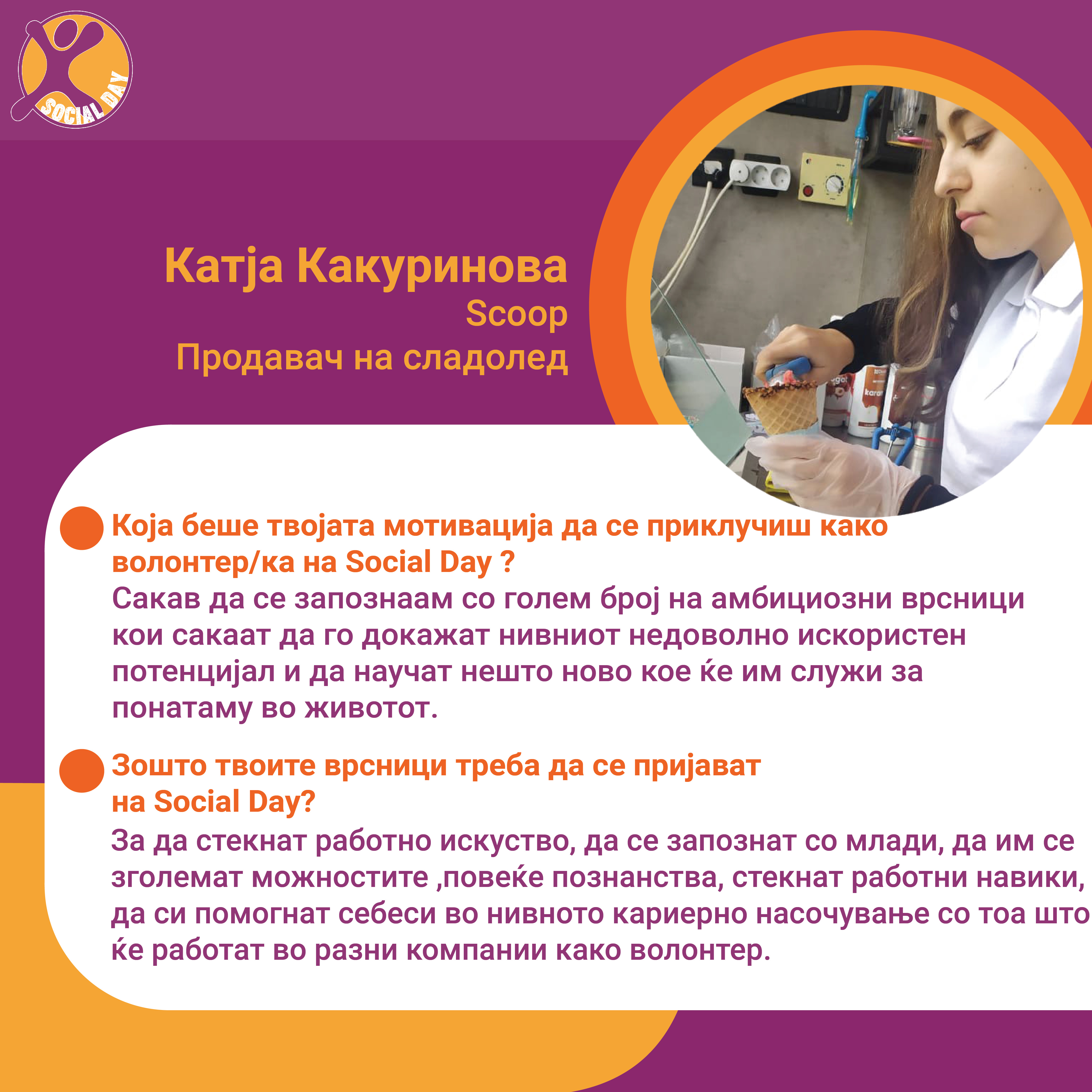 Токму ова се главните резултати од првиот SOCIAL DAY во Северна Македонија, спроведен од Здружение на граѓани Младите можат на 10ти ноември 2021г. На овој ден 30тина домашни компании и организации земаа учество и обезбедија позиции за над 80 средношколци, меѓу кои: Центар за Младински Активизам Крик, Ултра, Фондација Фридрих Еберт, кафуле СКУП, Македонски центар за меѓународна соработка, Кодит Солушн, Приватна агенција ДЕКРА , ИТ Лабс, Фондација Конрад Аденауер, козметичко студио Тропик Белеца, ЛЕАД Скопје, Бизнис академија Смилевски, ЕУРОНИКЛ – Кавадарци, ПЗУ Аптека ДНА АННИ ФАРМ, Национален Младински Совет на Македонија, РЕСОРТ МАВРОВО, Ултранет, Микел, Тинекс маркети, Рудник Бучим Радовиш